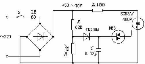 图中是一种典型的光控调光电路,其工作原理是:当周围光线变弱时引起光敏电阻RG的阻值增加,使加在电容C上的分压上升,进而使可控硅的导通角增大,达到增大照明灯两端电压的目的。反之,若周围的光线变亮,则RG的阻值下降,导致可控硅的导通角变小,照明灯两端电压也同时下降,使灯光变暗,从而实现对灯光照度的控制。